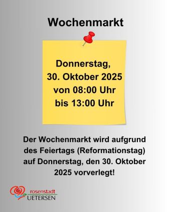Der Wochenmarkt der Stadt Uetersen wird aufgrund des Feiertags (Reformationstag) auf Donnerstag, den 30. Oktober 2025 vorverlegt!