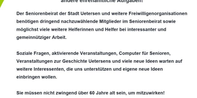 Der Seniorenbeirat der Stadt Uetersen und weitere Freiwilligenorganisationen benötigen dringend nachzuwählende Mitglieder im Seniorenbeirat sowie möglichst viele weitere Helferinnen und Helfer bei interessanter und gemeinnütziger Arbeit.