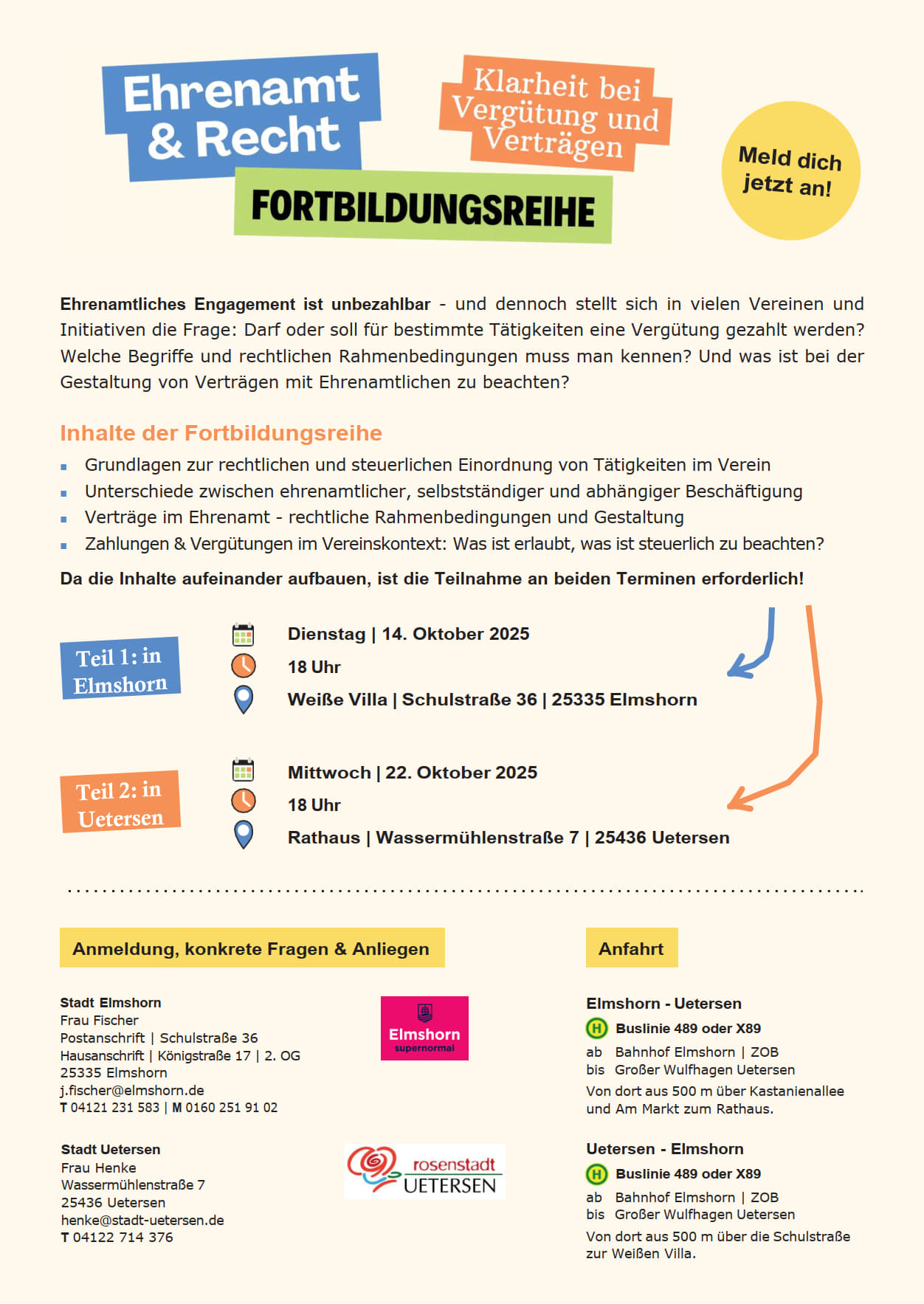 ehrenamtliches Engagement ist unbezahlbar – und dennoch stellt sich in vielen Vereinen und Initiativen die Frage: Darf oder soll für bestimmte Tätigkeiten eine Vergütung gezahlt werden? Welche Begriffe und rechtlichen Rahmenbedingungen muss man kennen? Und was ist bei der Gestaltung von Verträgen mit Ehrenamtlichen zu beachten? Diesen und weiteren Fragen widmet sich unsere zweiteilige Fortbildungsreihe „Ehrenamt & Recht – Klarheit bei Vergütung und Verträgen“, zudem die Stadt Elmshorn und die Stadt Uetersen Sie herzlich einladen. Diese Veranstaltung bietet Ihnen die Möglichkeit, Ihr Wissen im Bereich des Ehrenamts und Vereinswesens zu erweitern und zu vertiefen.