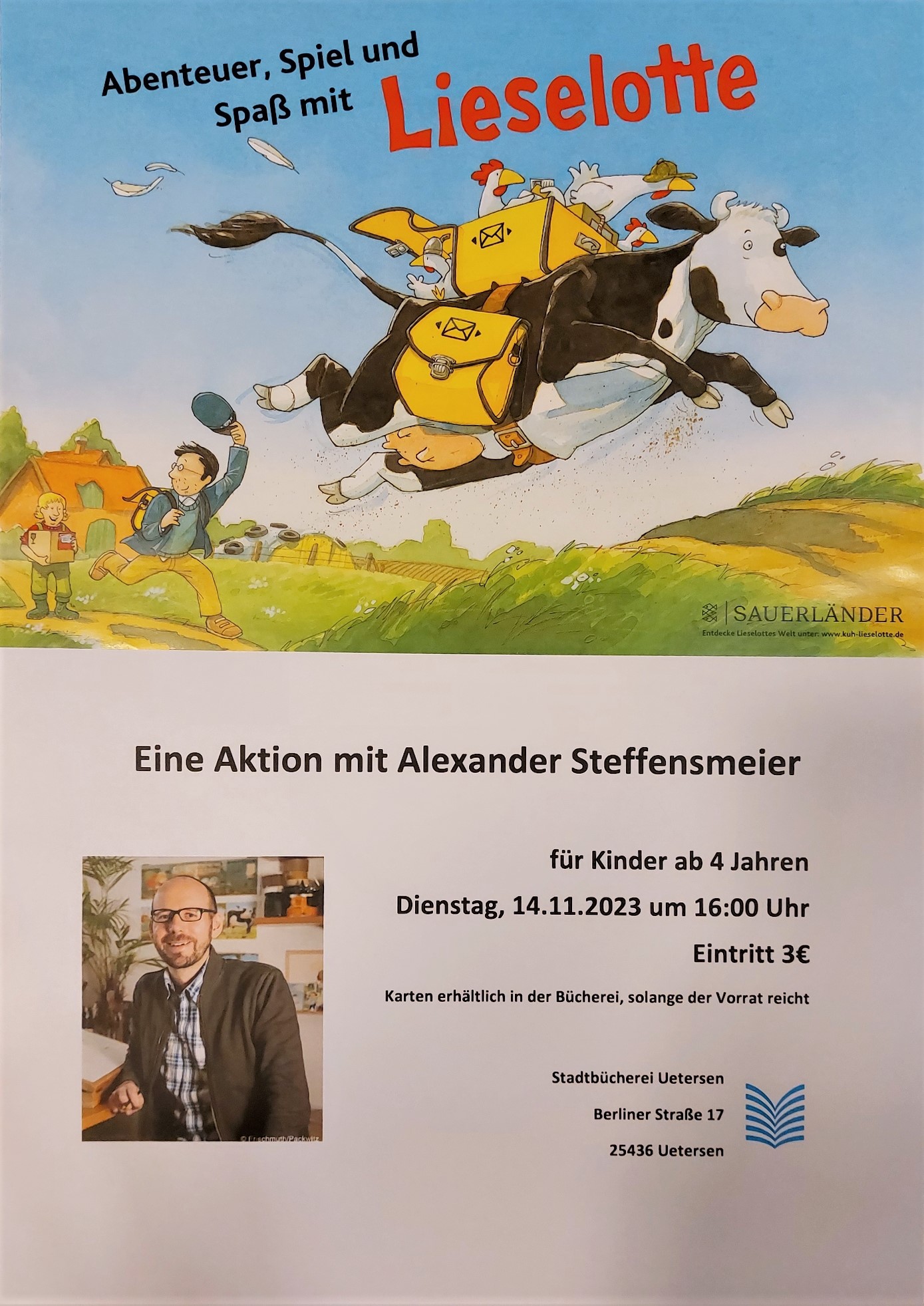14.11. um 16:00 Uhr: „Abenteuer, Spiel und Spaß mit Lieselotte“. Der erfolgreiche Bilderbuchillustrator erzählt eine Geschichte der beliebten Kuh Lieselotte und zeichnet dazu, für alle Kinder ab 4 Jahren. Eintrittskarten für 3,-- Euro in der Bücherei – solange der Vorrat reicht.